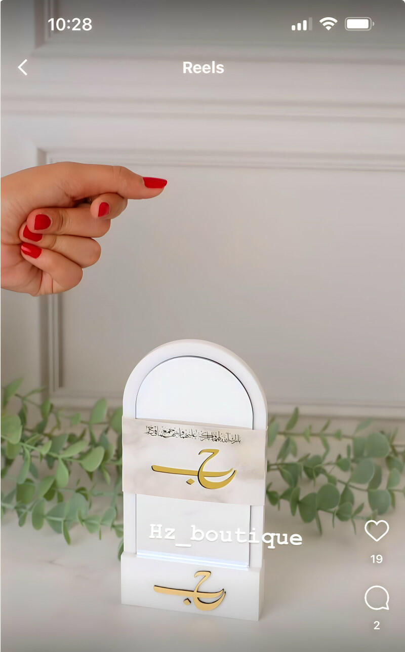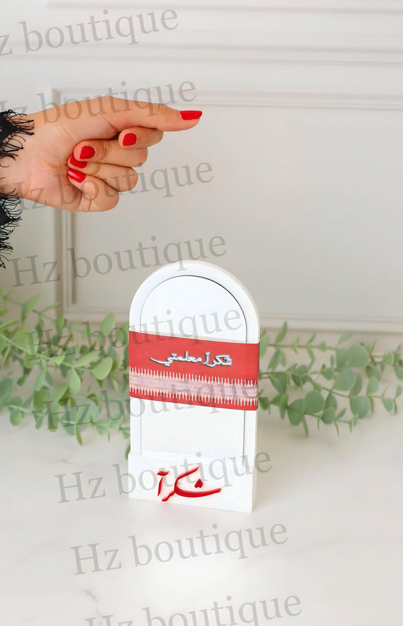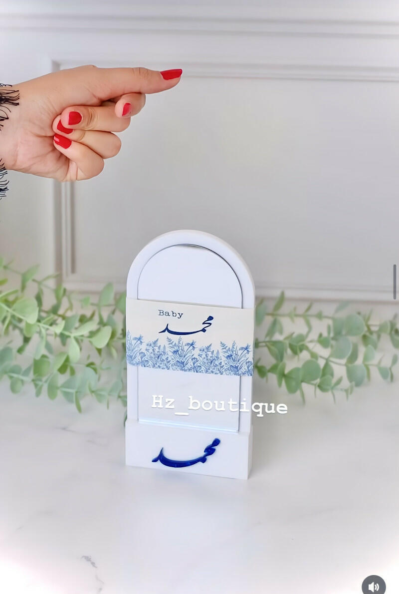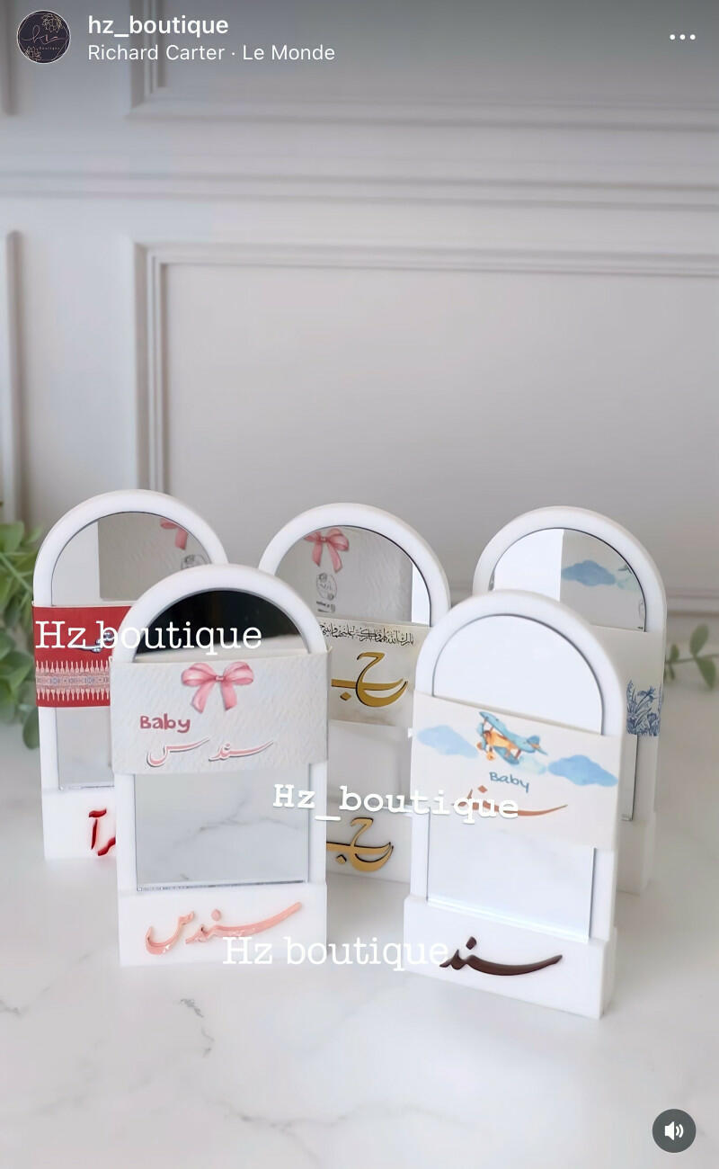 Favors featuring acrylic mirrors on an elegant and luxurious stand made of high-quality thick white acrylic, with a paper print customized according to the occasion and an acrylic name of your choice added to the stand. Minimum order of 10 pieces, with the option to customize each piece individually.